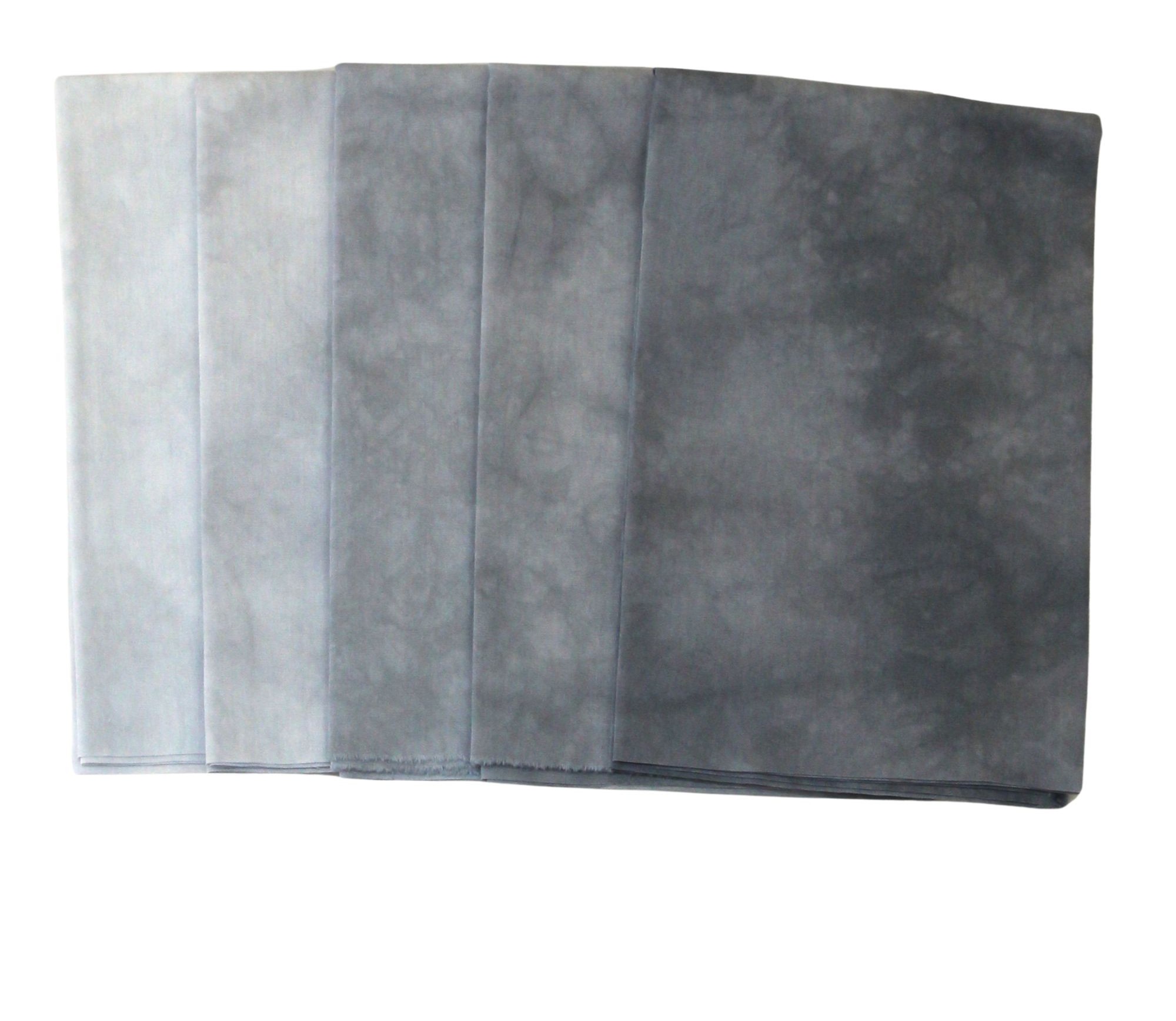 Hand dyed dove gray 5 step gradient cotton. Handmade fabric bundle includes 5 values. Highly textured semi-solids in a tone-on-tone gradation in 5 values. Works well as a blender fabric, like a batik. Great for shading. Good for bargello, or art quilting, but also works well in traditional quilting. Fabric has a thread count of approximately 76-78 and is suitable for hand embroidery as well as machine quilting. Fabric is fusible ready.