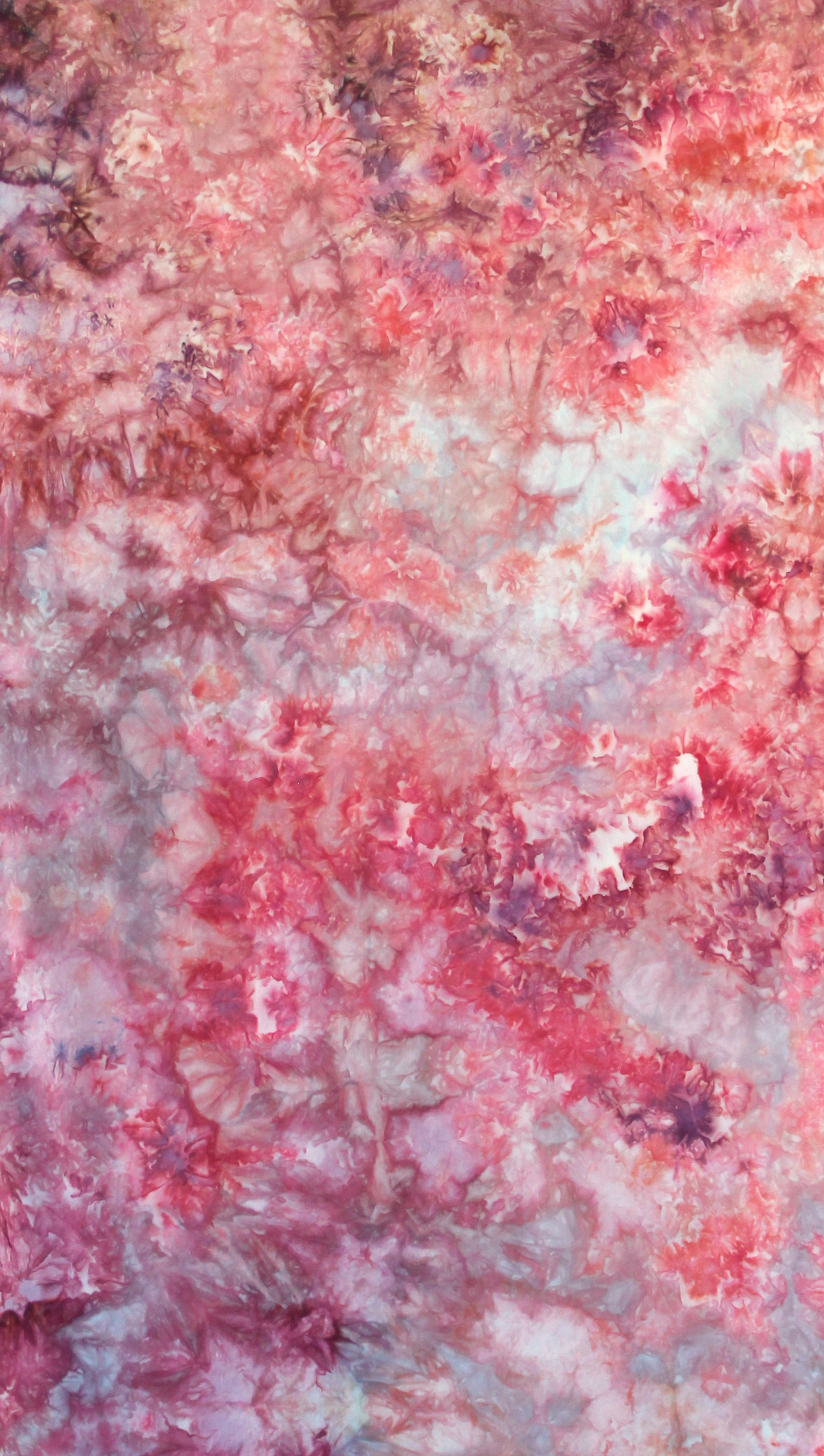 A variety of shades of coral pink and purple on a half yard of quilting cotton. Ice dyeing creates wonderful secondary colors in the mix. The blended colors and high texture make it suitable for multiple quilting projects, from applique and piecing to modern quilts and art quilts. Fabric has a thread count of approximately 76-78 and is suitable for hand embroidery as well as machine quilting. Fabric is fusible ready.