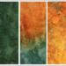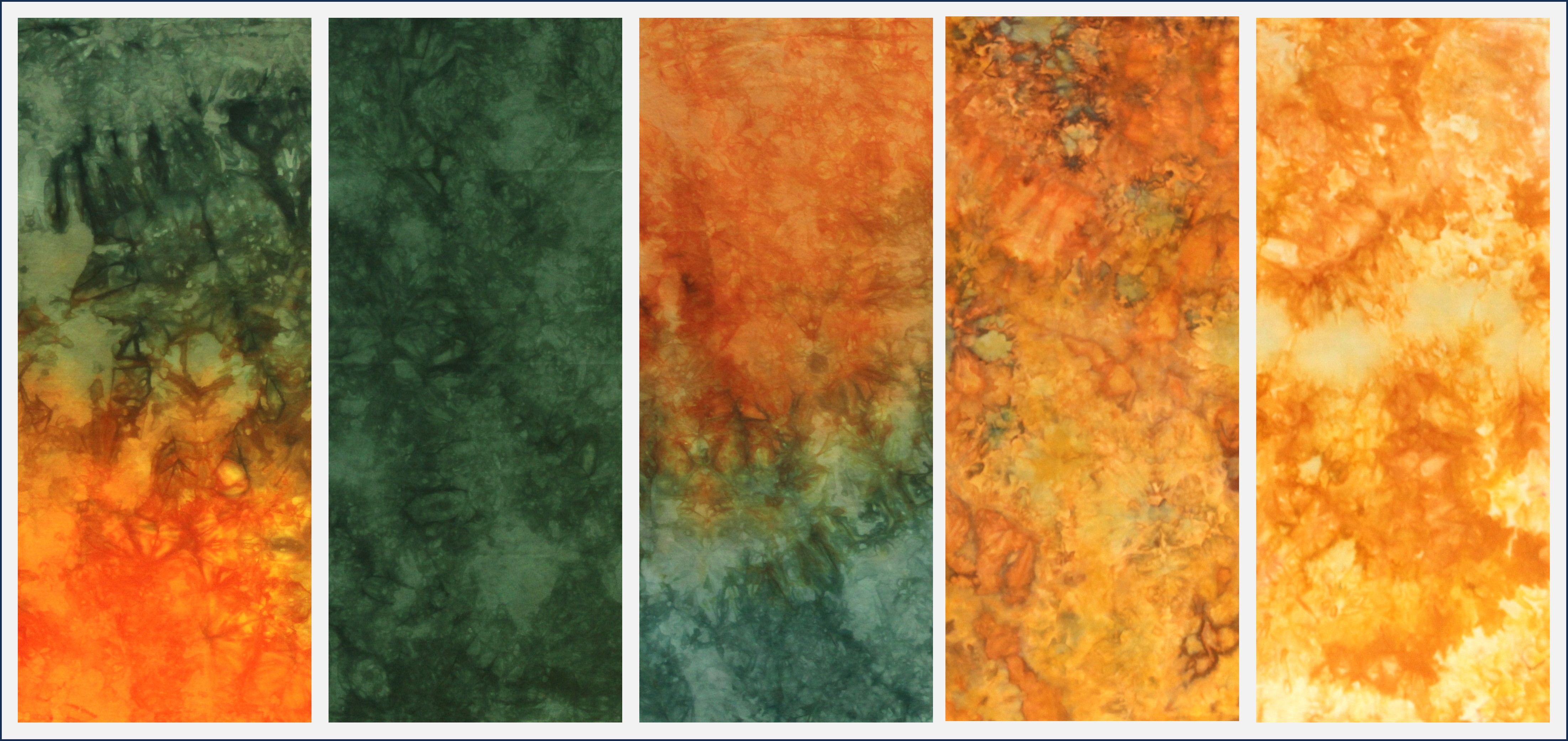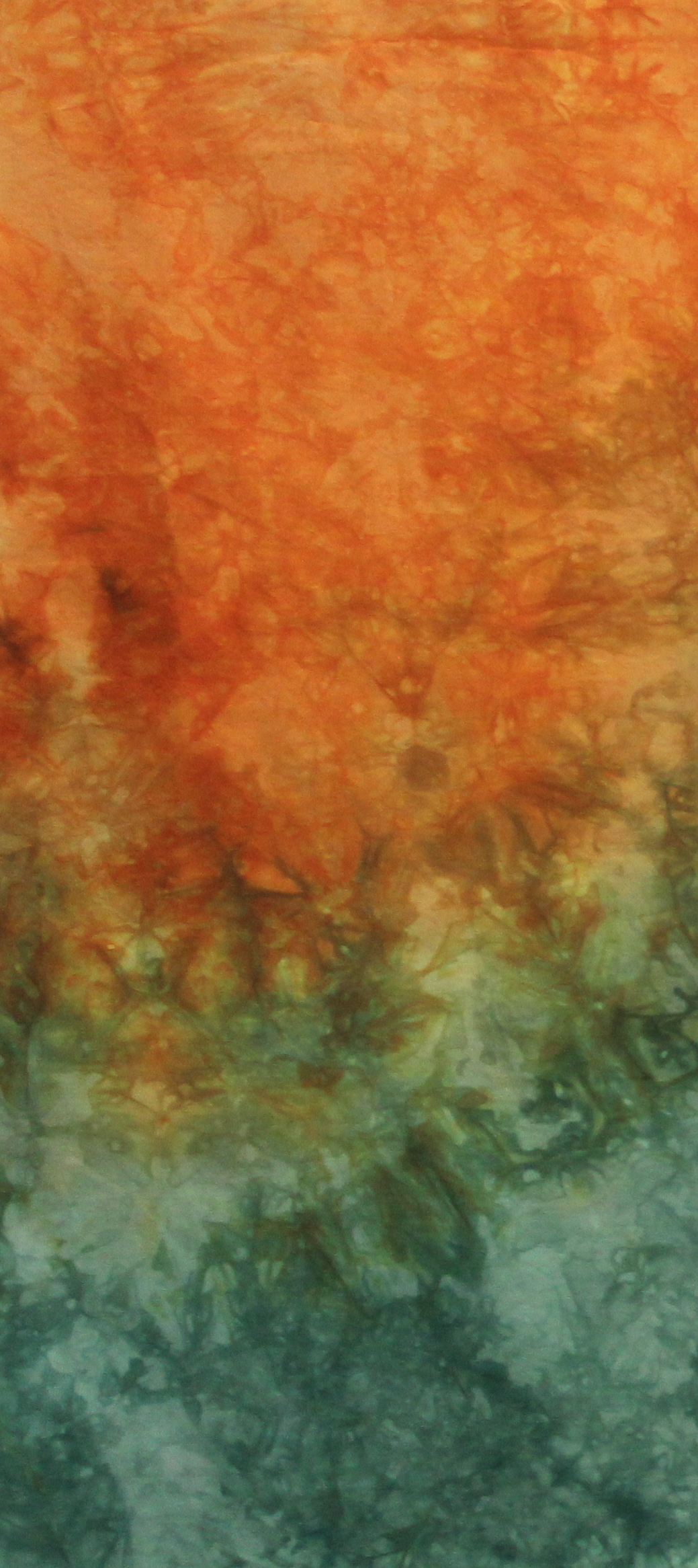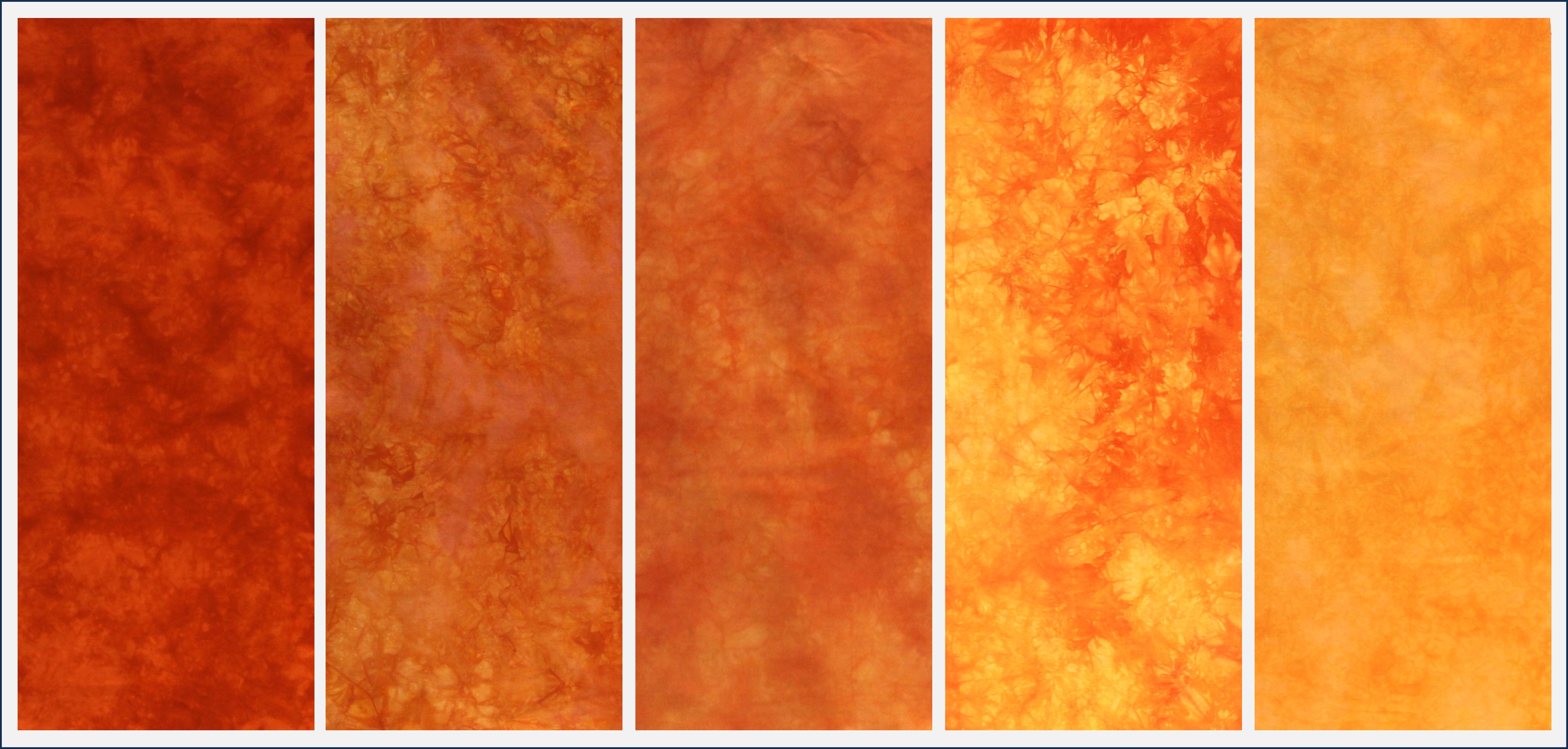 Each piece of fabric has been dyed with my own recipe of Procion MX dyes, and washed according to the manufacturer's instructions. After multiple hot washes to remove the excess dye, each piece is steam ironed on white muslin to check for color fastness under normal piecing or fusing conditions. Cold wash recommended. Use of a color catcher is advised if using a hot wash.